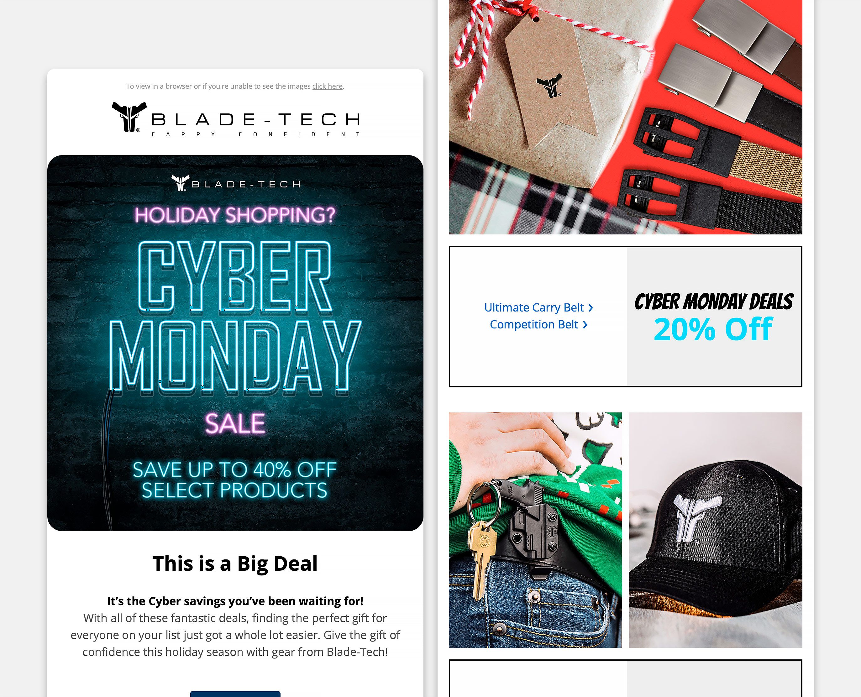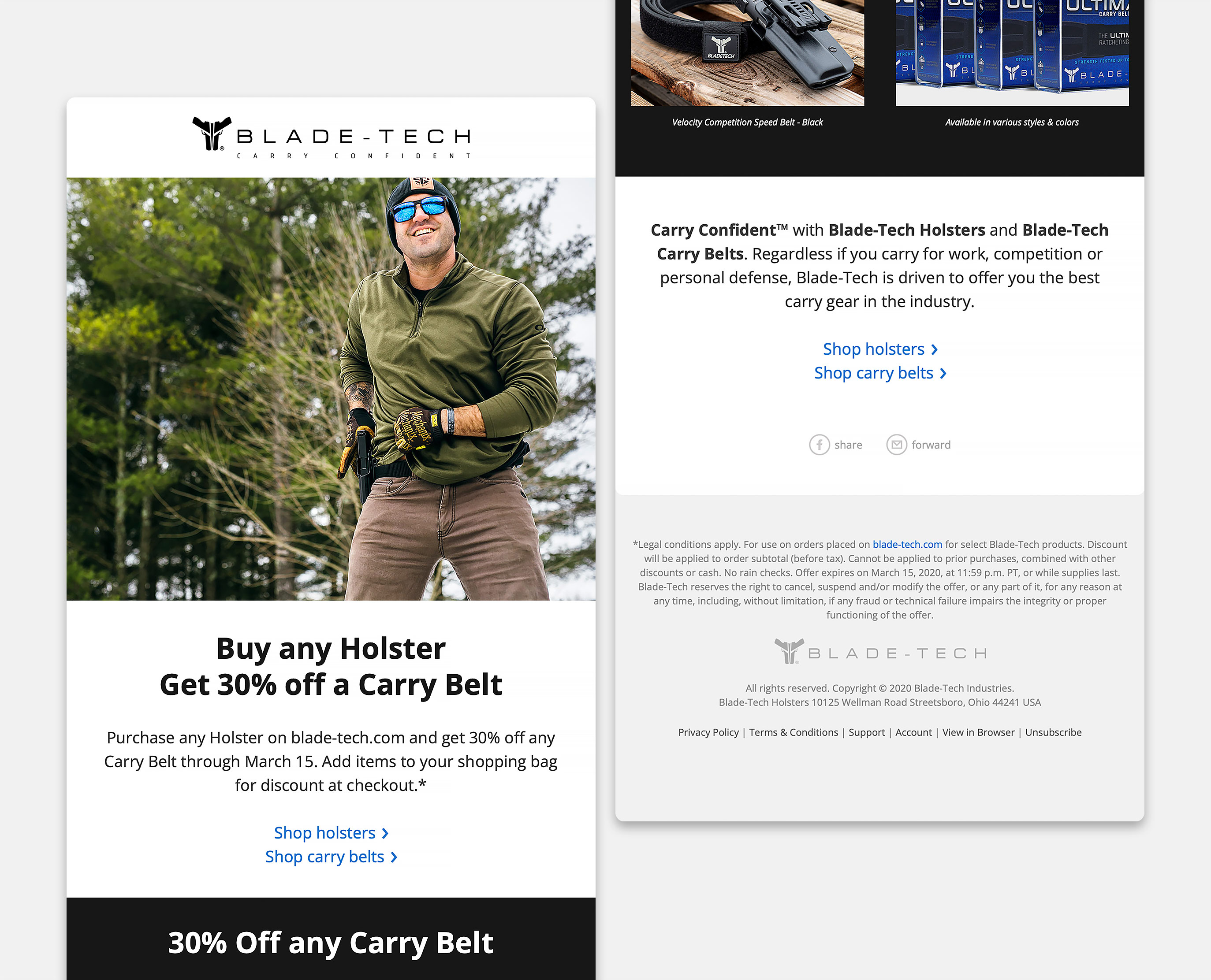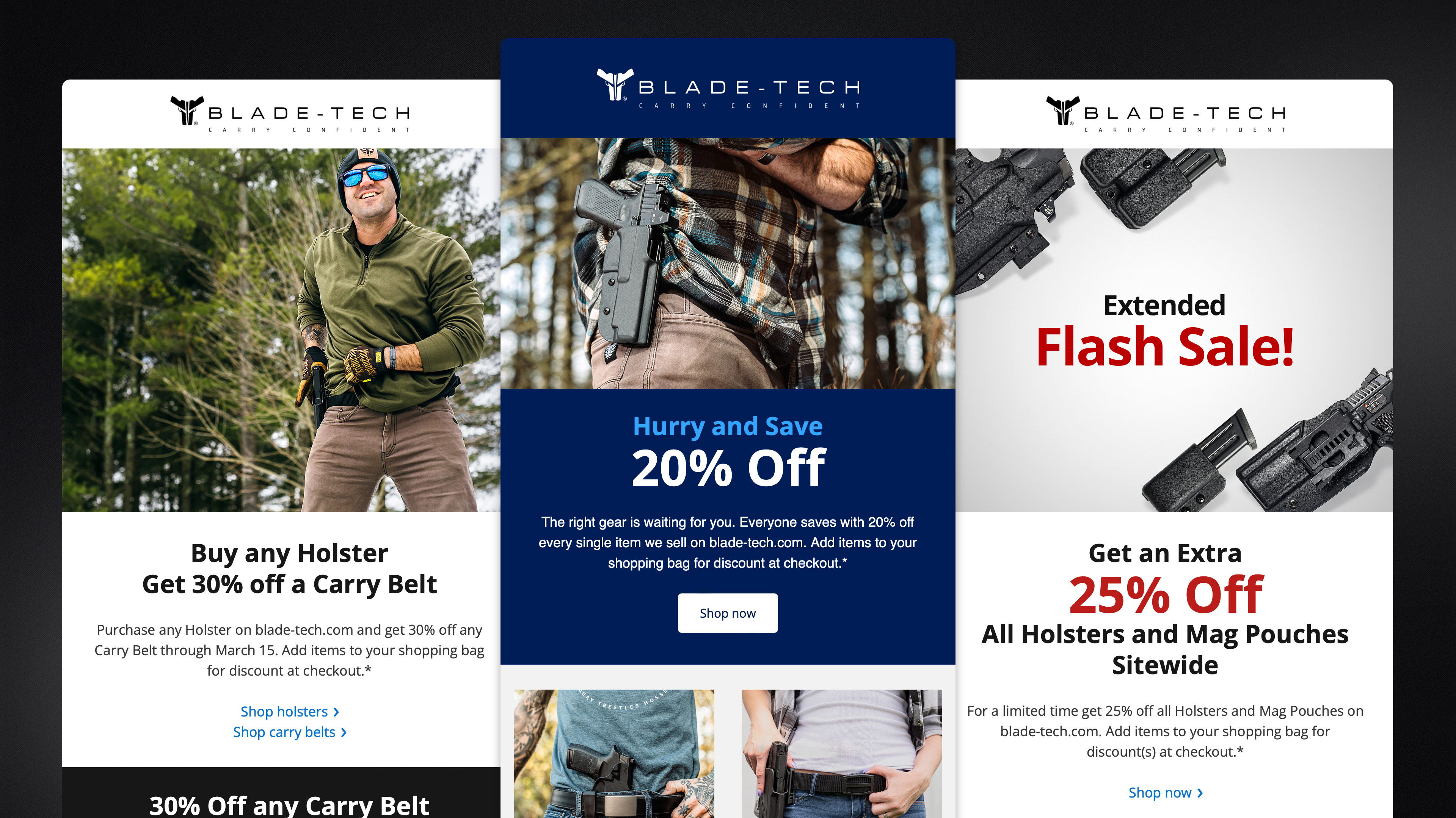 Blade-Tech Industries, based in the Cleveland metropolitan area, is a global manufacturer of carry gear for civilian, military, and law enforcement markets. The company requested targeted, offer-based email campaigns and responsive email templates that would help drive traffic to their eCommerce store.