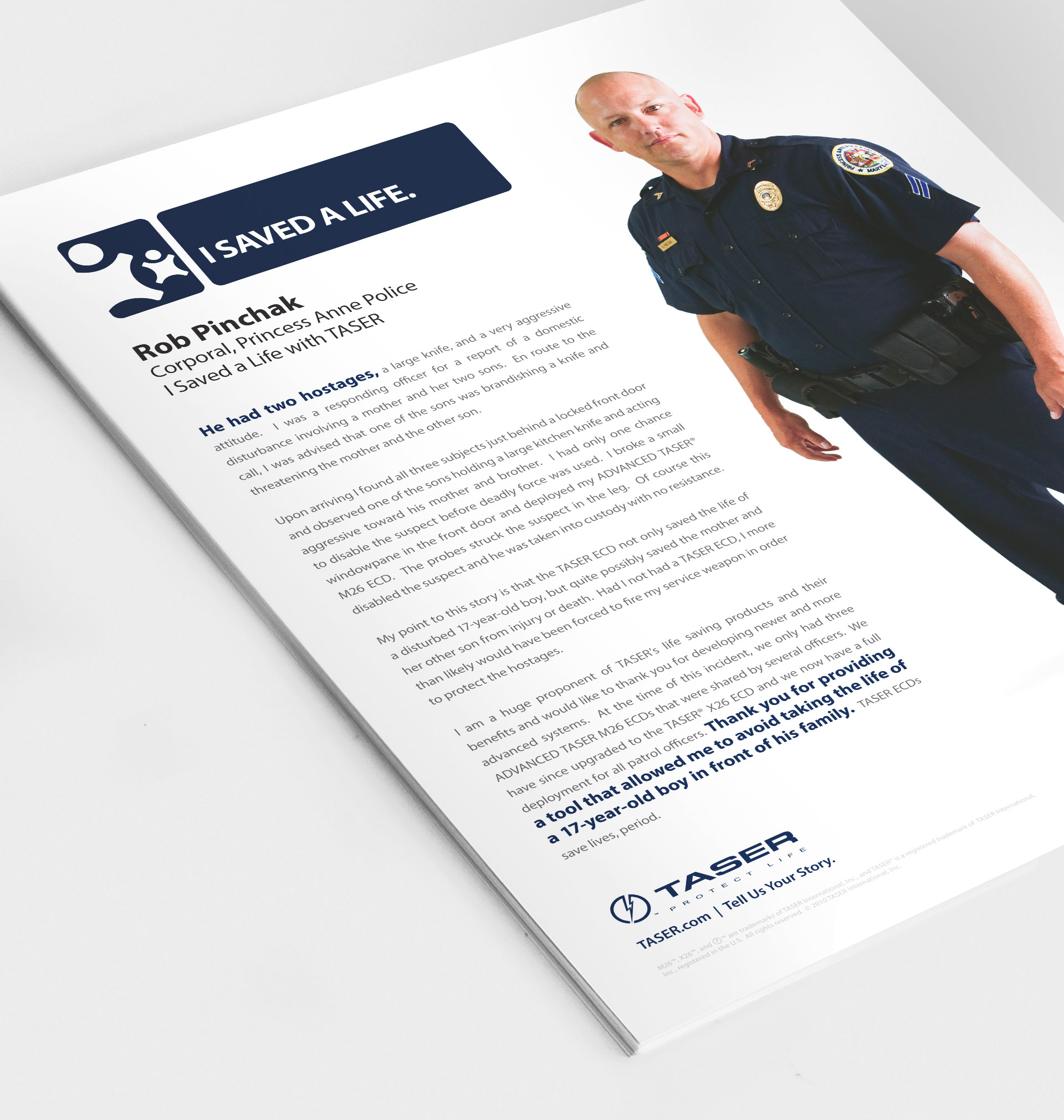 This campaign focused on law enforcement officers using TASER CEWs and the reduction of officer and suspect injuries. I designed a stylized logo that reveals two people within its negative space with a softer logotype. I built digital and print marketing campaigns to drive officers to submit their TASER stories on how they saved a life.