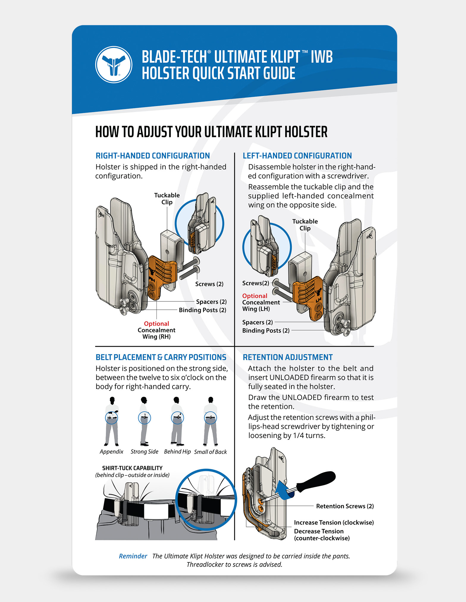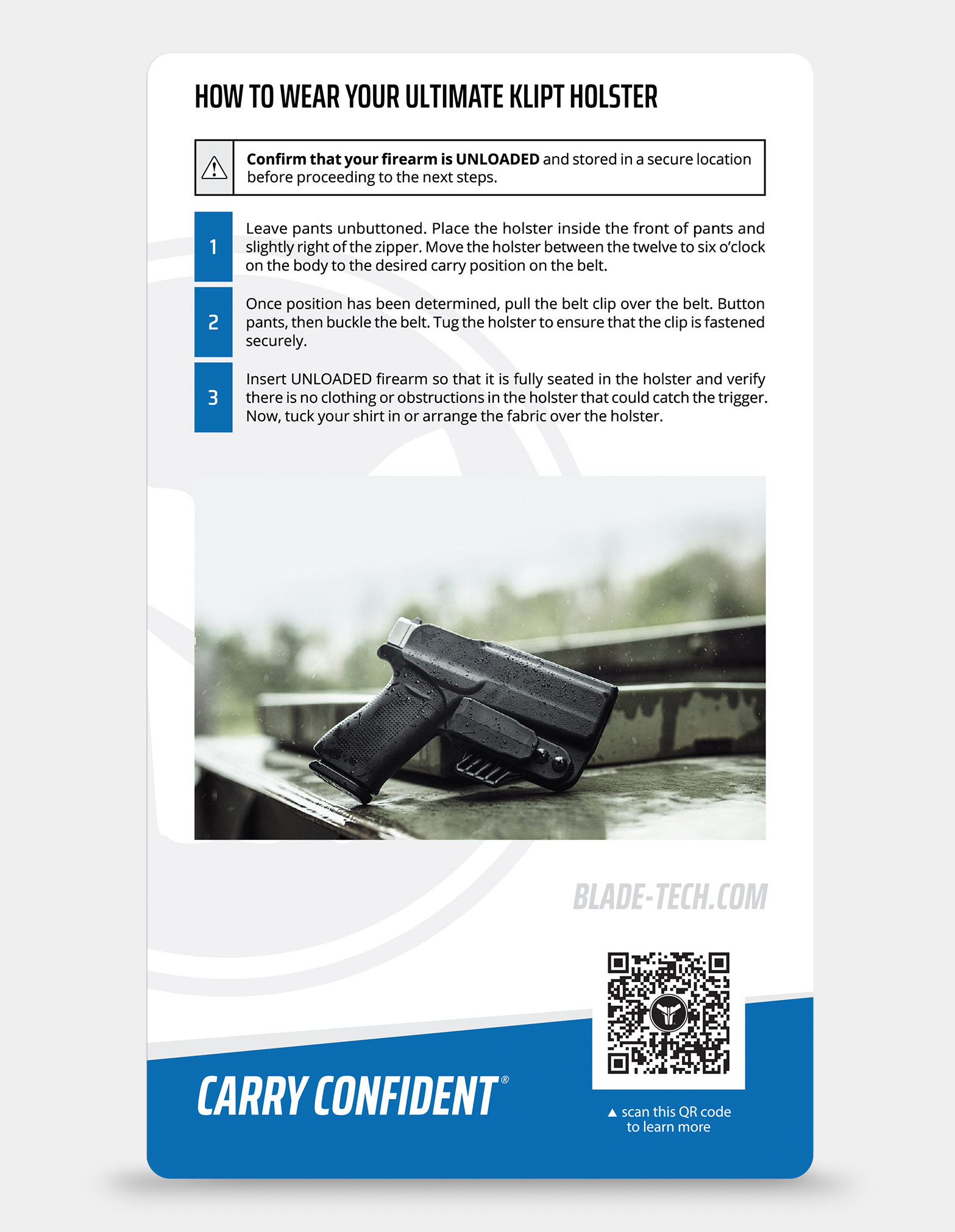 Blade-Tech Industries, based in the Cleveland metropolitan area, is a global manufacturer of carry gear for civilian, military, and law enforcement markets. The goal was to create new retail packaging and quick-start guides for their entire consumer product line.