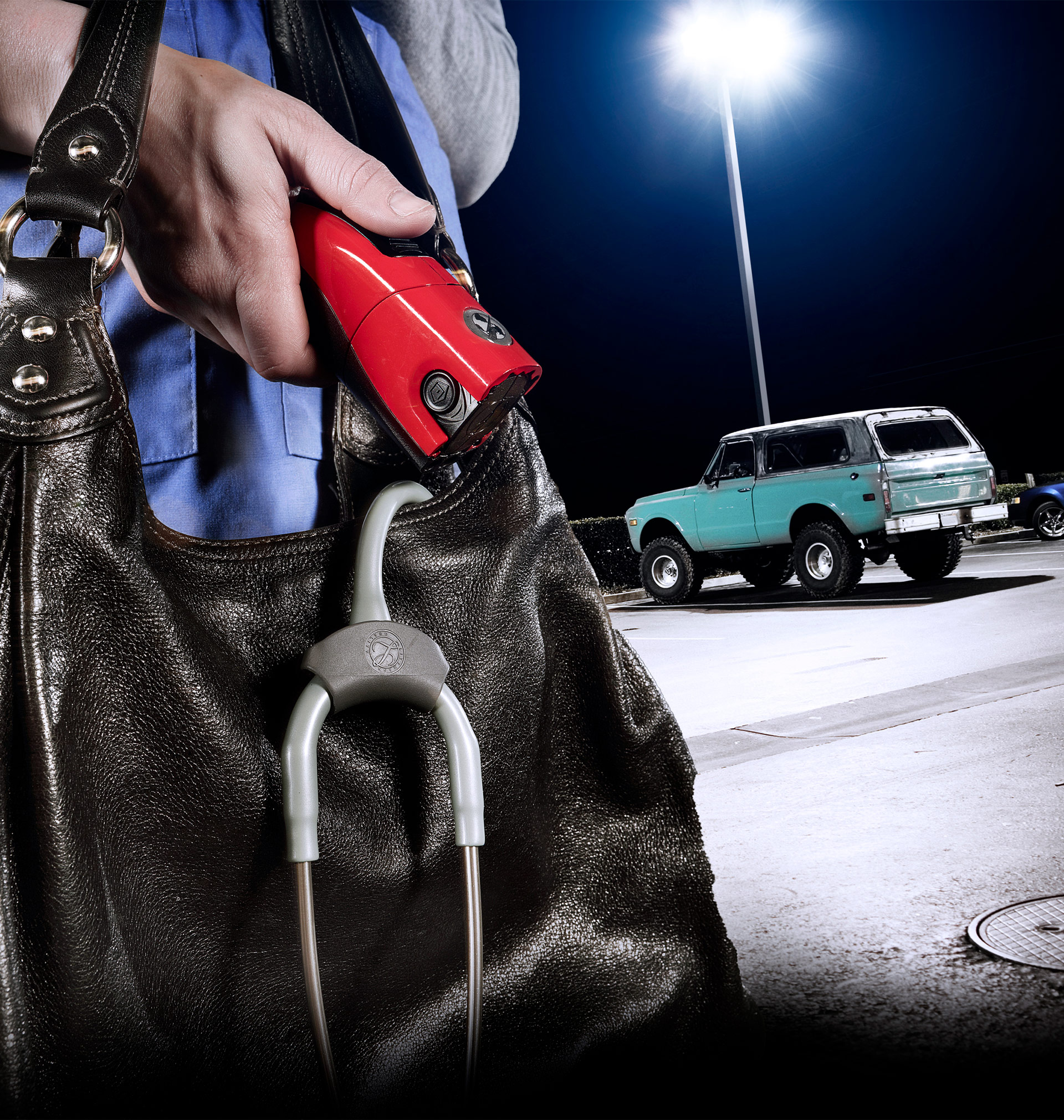 Based on the company’s objectives, I utilized a commercial photographer to capture the model during an outdoor photoshoot. I produced the final composite imagery. The goal was to tell the story of a young nurse walking to her vehicle after a long day at work. The image conveyed a feeling of protection, strength, safety, and self-confidence.