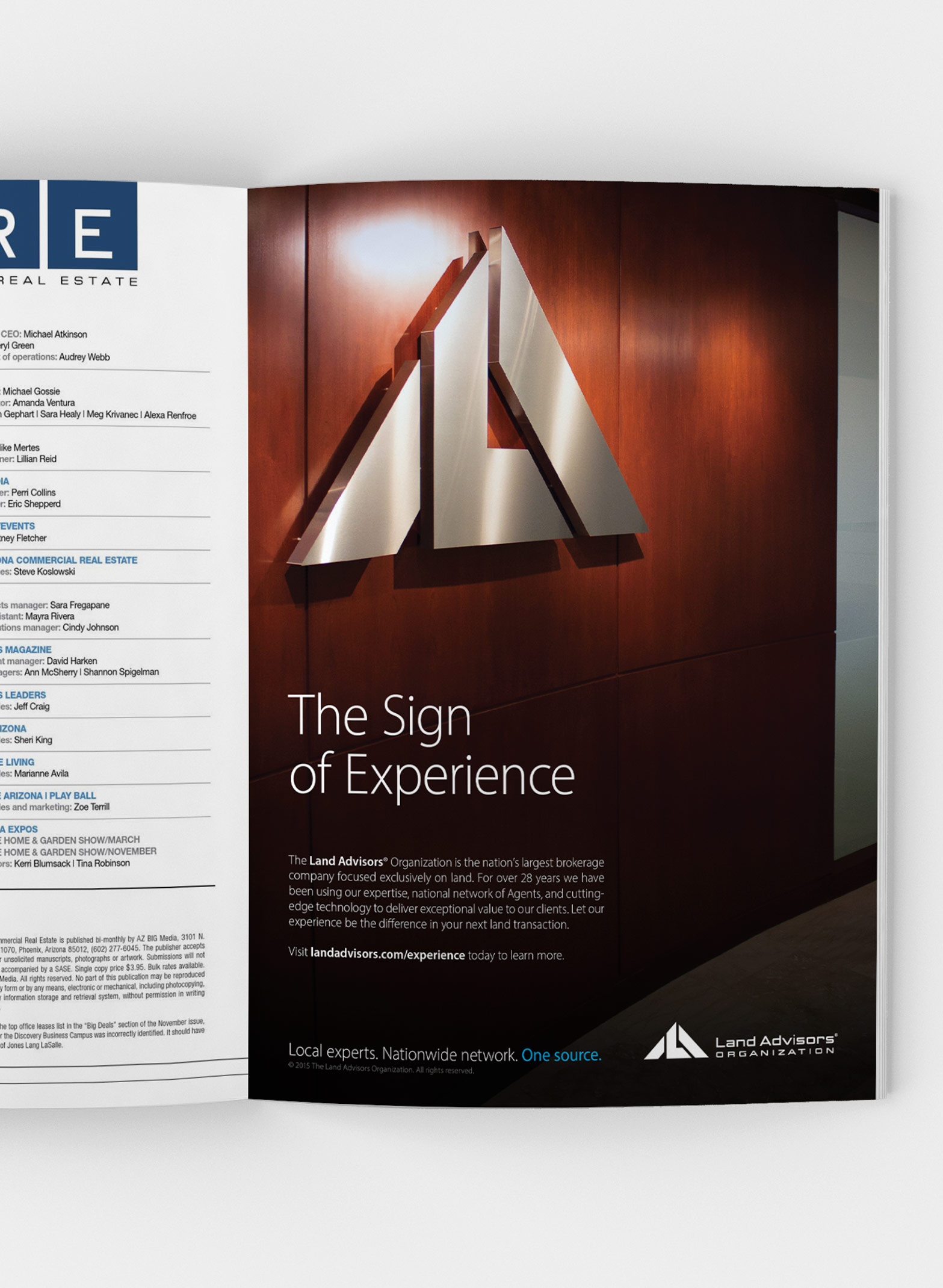 The Land Advisors Organization, based in Scottsdale, is America's largest brokerage firm focused exclusively on land. The company required a full-page print ad for AZRE Magazine. The goal was to play off the Sign of Experience title and the Land Advisors Organization's sign.