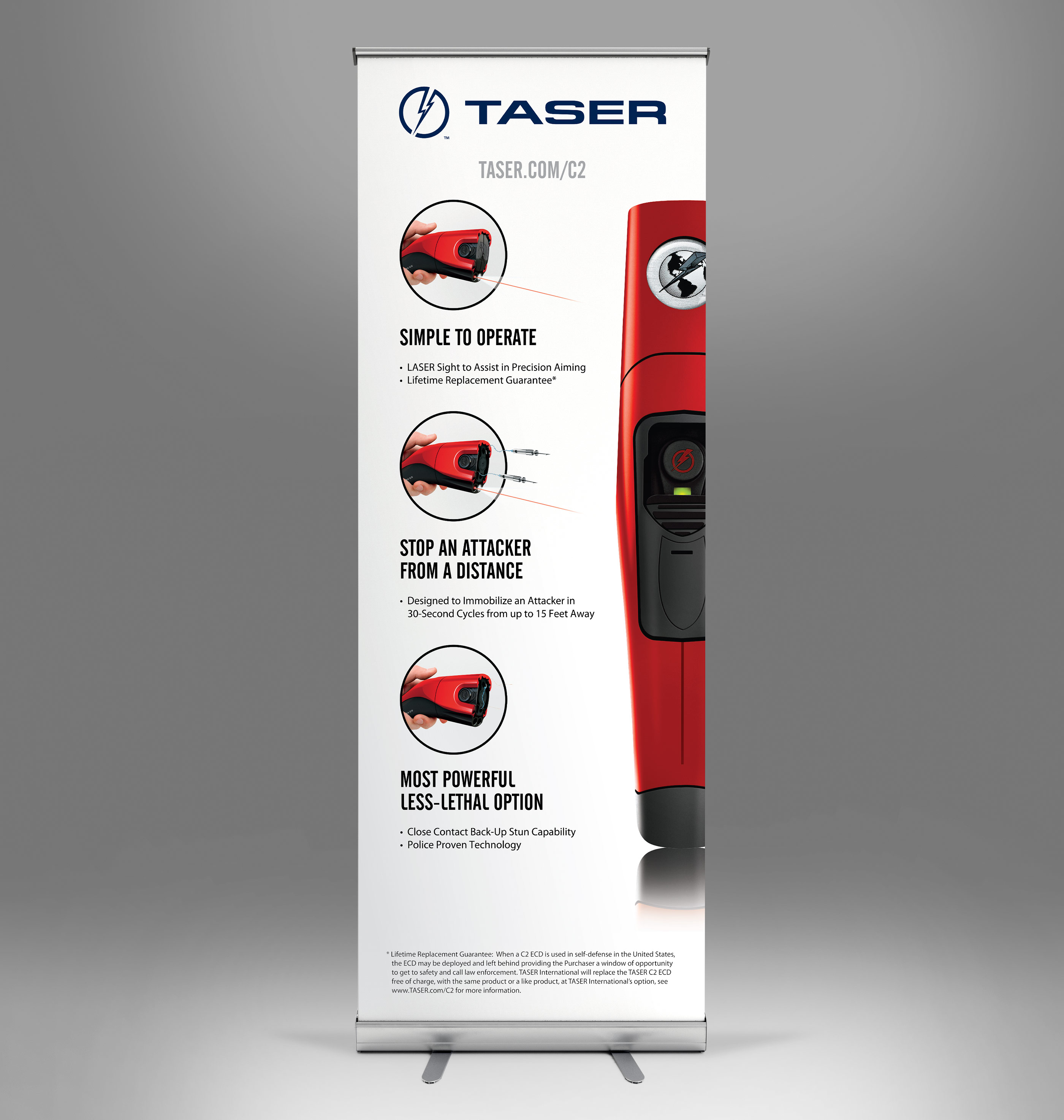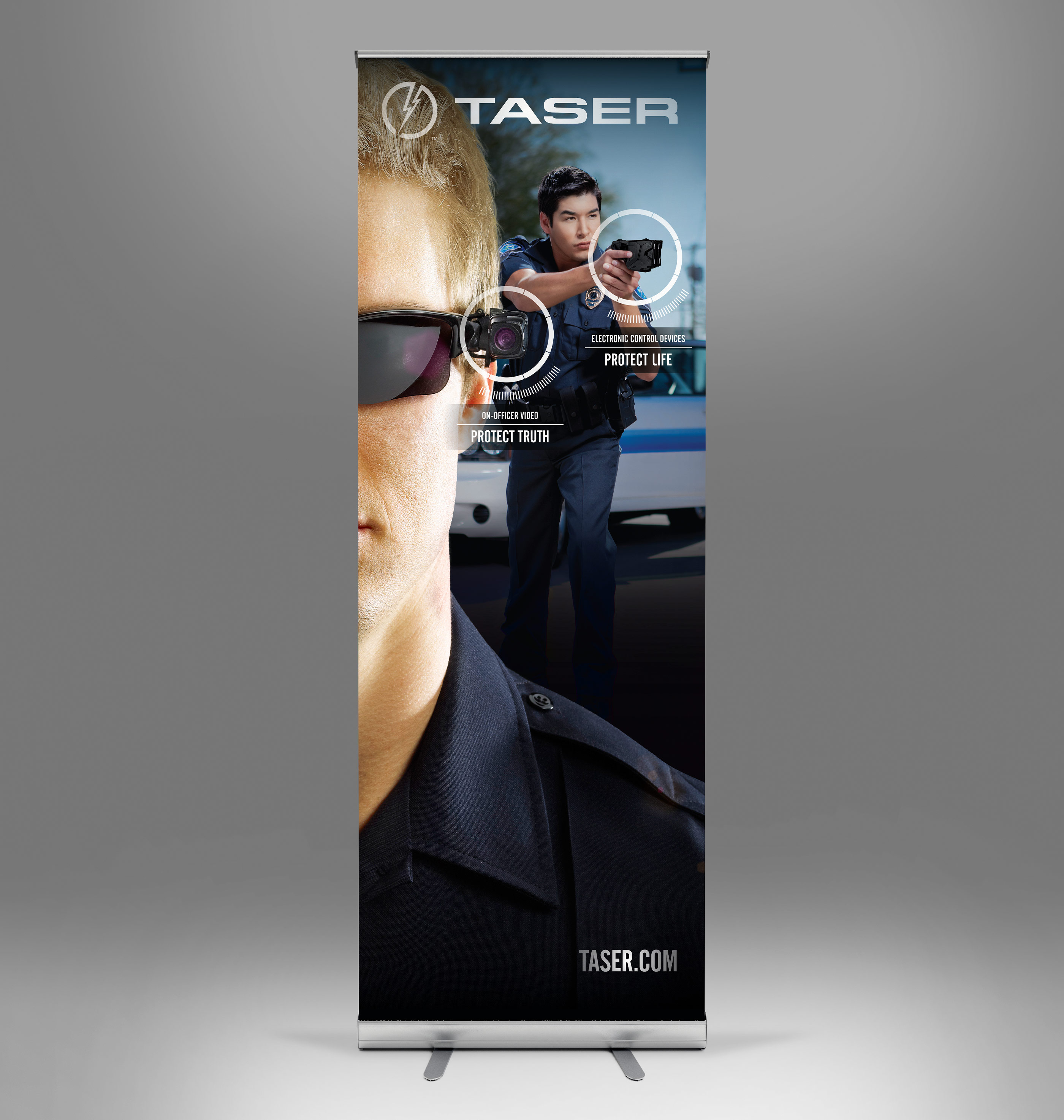 Staying true to the company’s brand standards, the banner stands have layouts that are simple, and clean and represent the essence of the TASER brand. These portable, large-format banner stands were used to promote both B2B and B2C company products as well as the company hiring events.